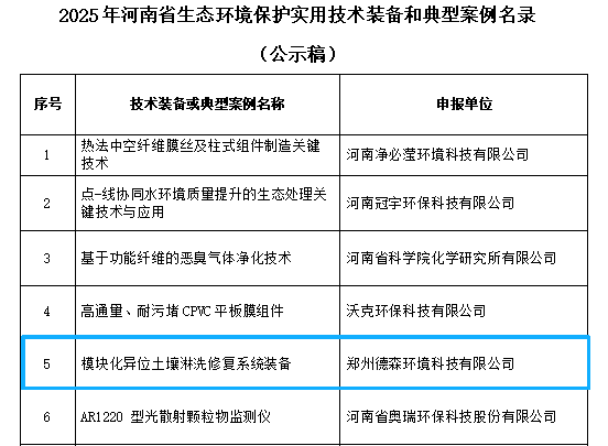 喜报!我司 “模块化异位土壤淋洗修复系统装备” 入选 2025年河南省生态环境保护实用技术装备和典型案例名录